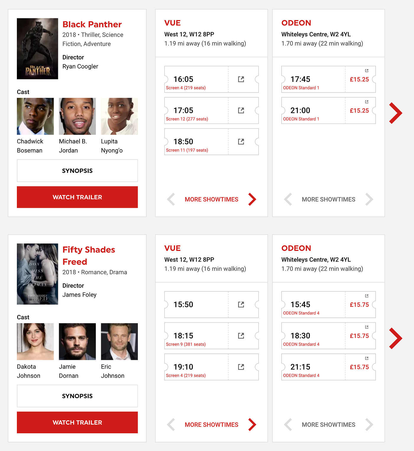 }This example is obtained from the front-page of https://go2cinema.com/ (a cinema showtimes discovery platform). This query retrieves all of the information required to generate the list of movies in the cinemas and the associated list of events – just the other way around – starting with the events and retrieving movie and venue for each event.