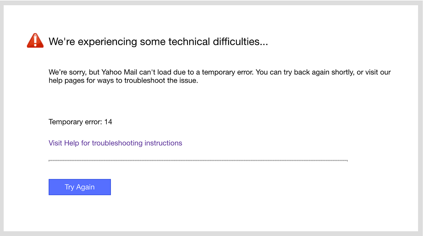 The error disappeared after a while, but the inbox came back empty. I am assuming that all the data has been either lost or automatically purged by some Yahoo! maintenance setting.
