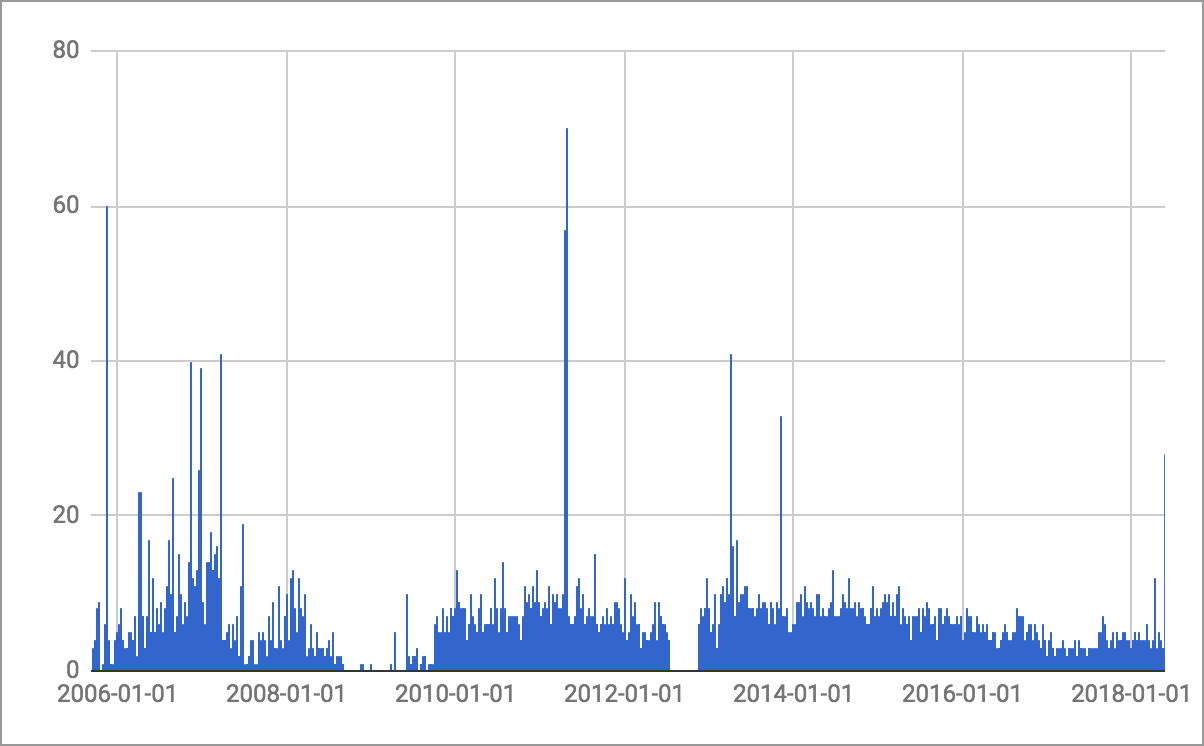 The distribution of emails by date does not reveal any extremely surprising trends (median 3, mode 2).