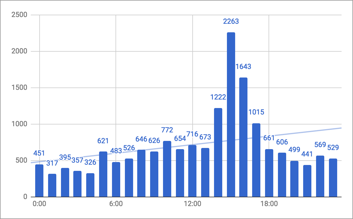 Distribution of emails by time of the day shows emails peak at 15:00 UTC.