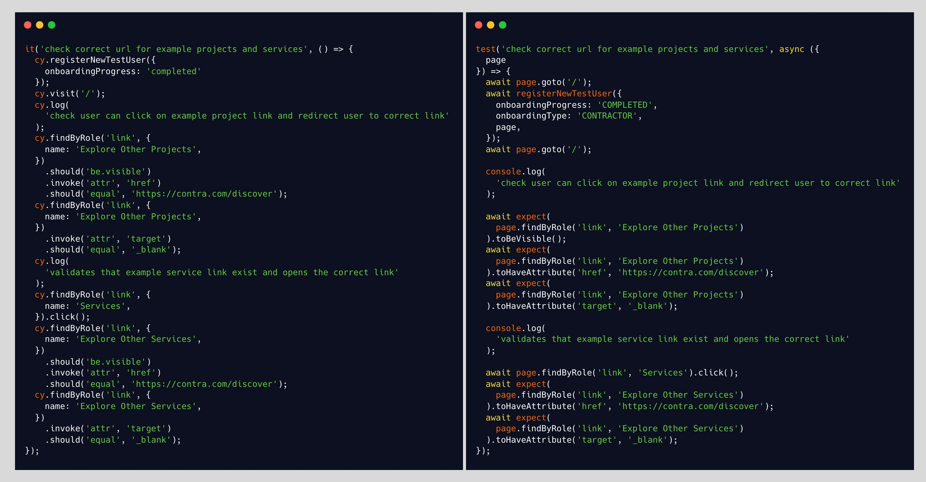 The implementation of the last test is quite different. Still, it is mostly because the human migrating the tests made opinionated choices when rewriting the tests (e.g., subsiding nth-based selectors with has-text). Otherwise, they are functionally equivalent.