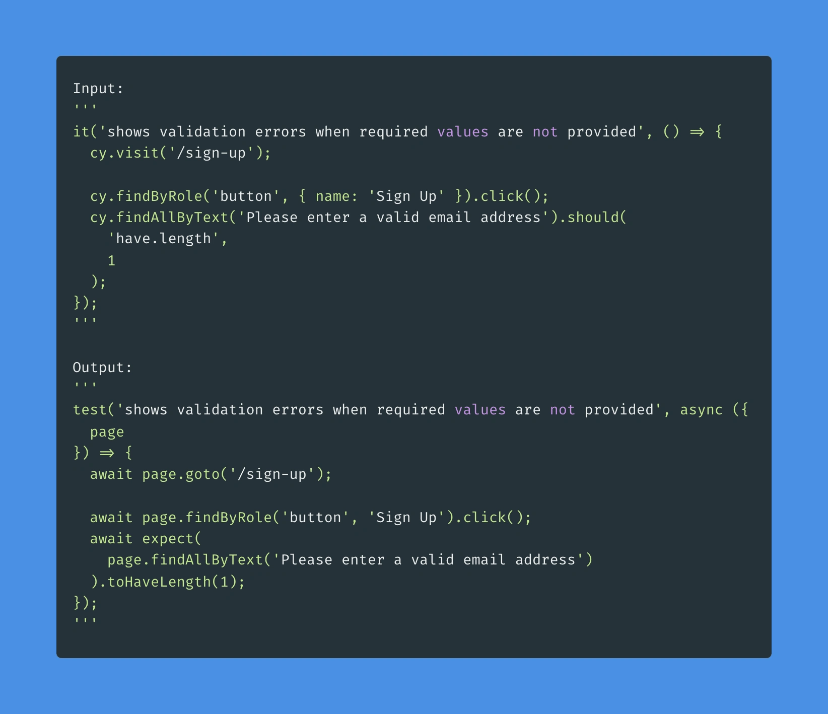 It is worth noting that the training example is not a valid test (it would fail if executed) but rather a collection of patterns that we use across all tests. Also, to remove any biases, I've used only the tests that we've already migrated by hand for the inputs.