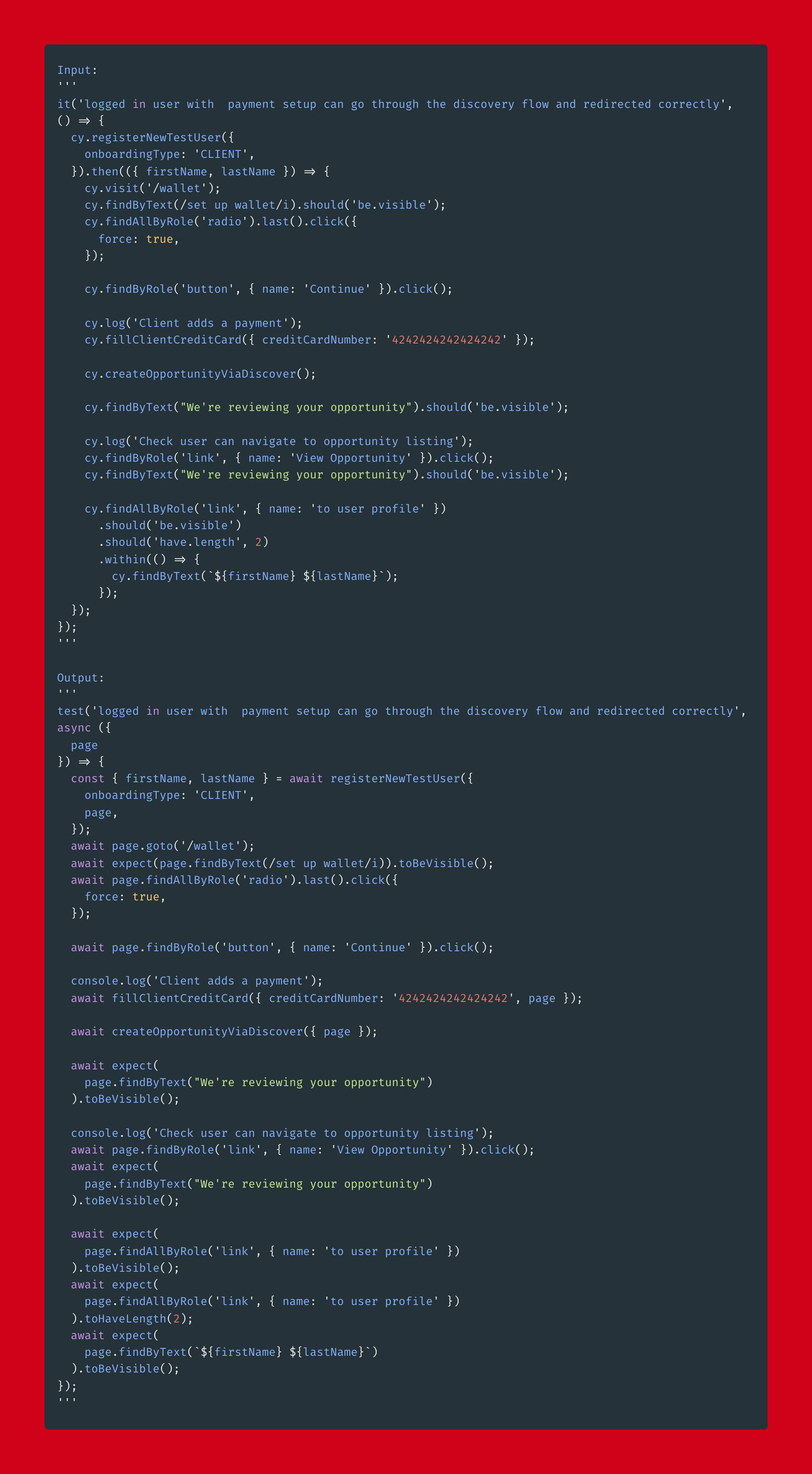 Cypress and @playwright/test are two competing integration testing frameworks. We have been using Cypress for a long time but recently made a decision to migrate our Cypress tests to Playwright, all 400 of them. It is absolutely worth it for the speed and reliability gains (a future post)... However, it meant a lot of manual work! Or so I thought...