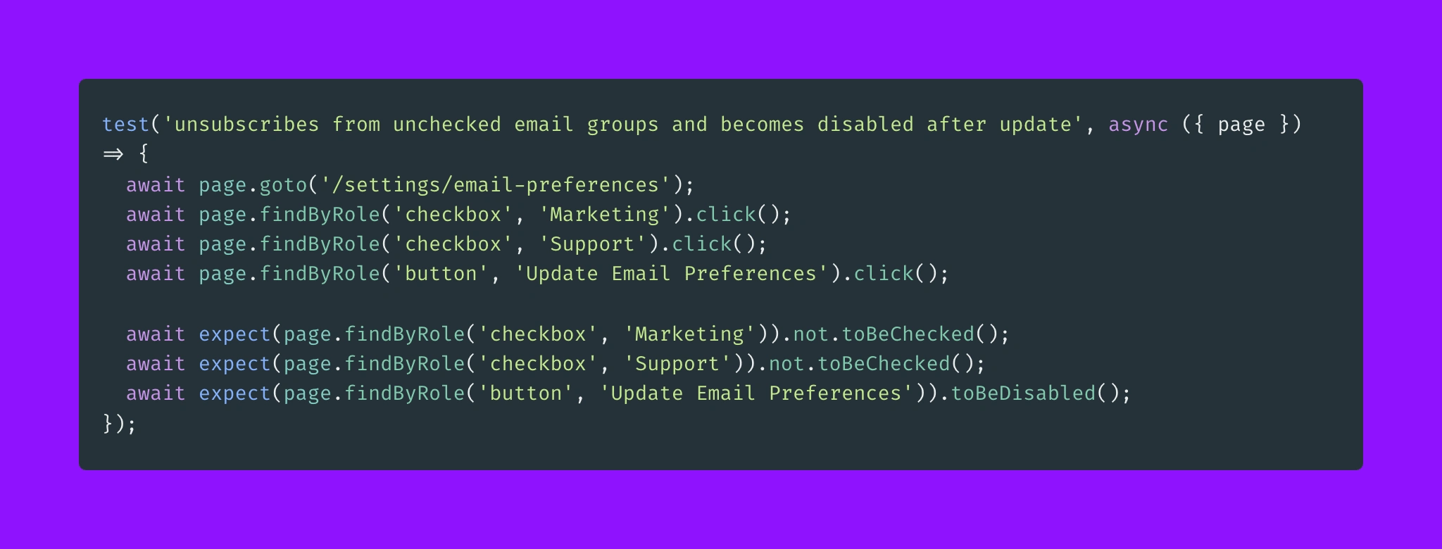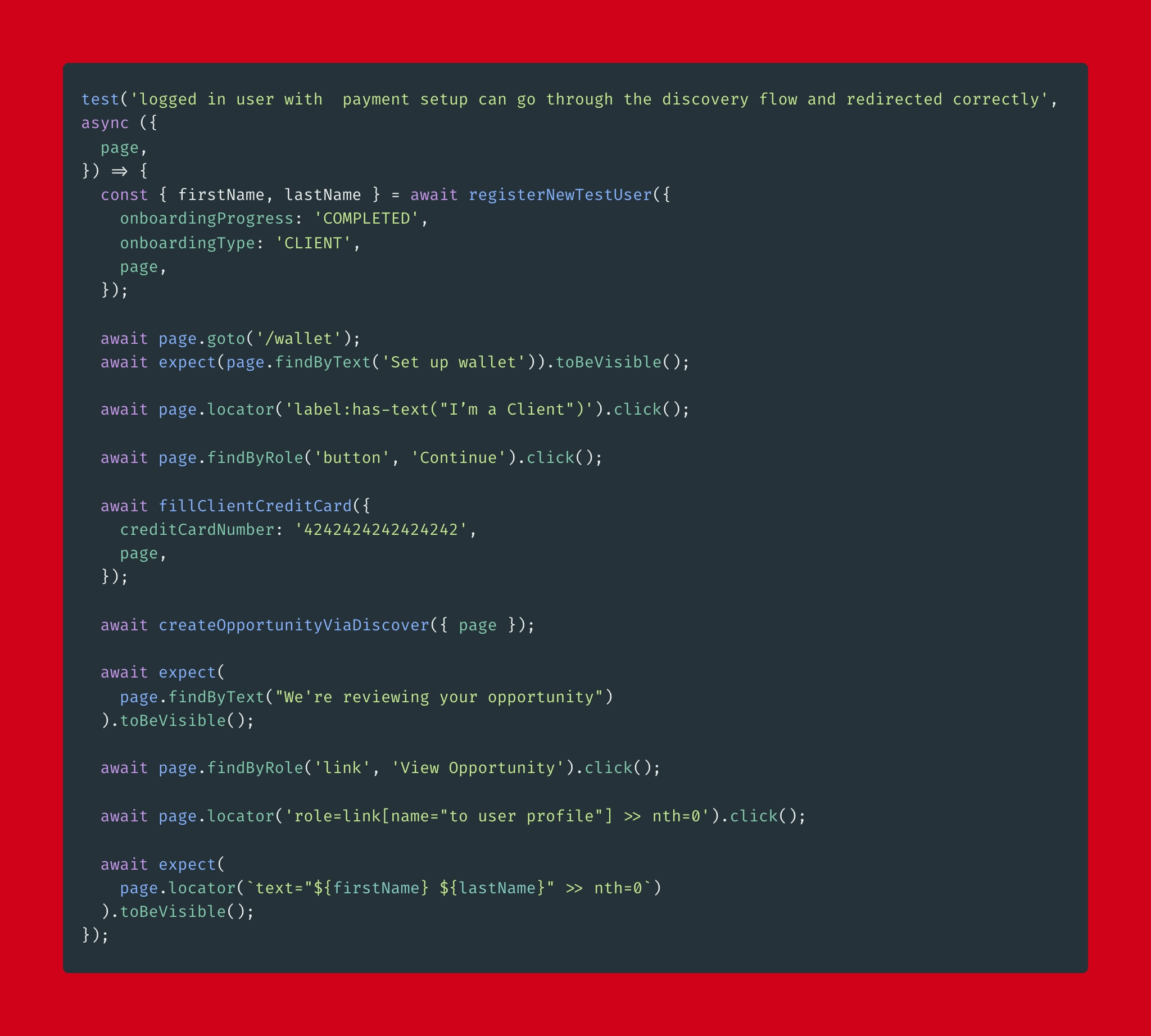 Similar to the purple example, what is really impressive about GPT3 is how it handles scenarios that it has not seen before. The whole registerNewTestUser callback is not something that was available in the training dataset.